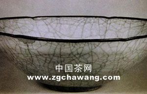 這件青瓷茶碗是南宋時(shí)杭州官窯生產(chǎn)的青瓷器。茶碗壁薄胎細,胎色呈紫黑色,釉面開(kāi)裂,裂片紋冰裂疏密不一,重疊交錯,深淺不同,
