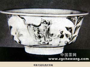 這件青花瓷乳虎紋茶碗,大約是15世紀時(shí)明代景德鎮民窯產(chǎn)的飲茶用具。該碗裝飾畫(huà)面用線(xiàn)活潑,縱筆揮灑,給人一種新鮮活潑的美感。