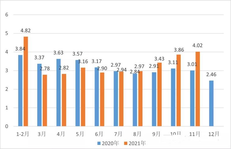出口方面據中國海關(guān)數據,2021年11月,中國茶葉出口量為40194噸,出口額為23106.4萬(wàn)美元。2021年1-11月,中國茶葉累計出口量為336935噸,累計出口額為209614.5萬(wàn)美元。2020-2021年各月中國茶葉出口量比較 (單位:萬(wàn)噸) 2020-2021年各月中國茶葉出口額比較 (單位:萬(wàn)美元);進(jìn)口方面:據中國海關(guān)數據,2021年11月,中國茶葉進(jìn)口量為3730.8噸,進(jìn)口額為1532.5萬(wàn)美元。1-11月,中國茶葉累計進(jìn)口量為42651.3噸,累計進(jìn)口額為167
