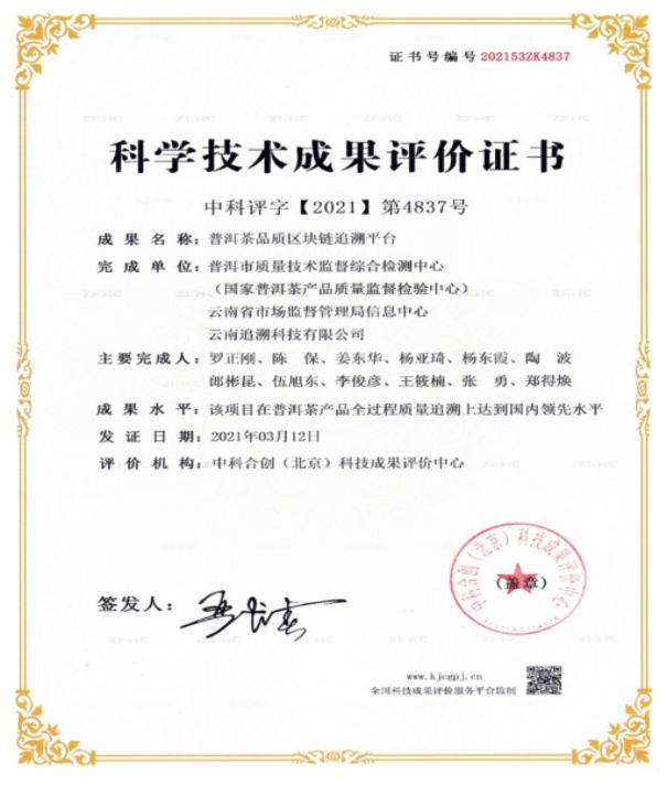 日前,第三方專(zhuān)業(yè)科技成果評價(jià)機構依據科技部《科學(xué)技術(shù)評價(jià)辦法》,組織同行專(zhuān)家對國家普洱茶產(chǎn)品質(zhì)量監督檢驗中心完成的“普洱茶品質(zhì)區塊鏈追溯平臺”項目科技成果開(kāi)展評價(jià)。...