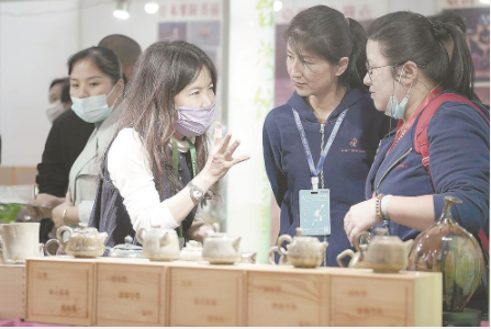 一位臺灣參展商(左)在介紹公司生產(chǎn)的特色茶具。 本報記者 王毅 攝一位臺灣參展商(左)在與客商泡茶交流。本報記者 王毅 攝臺商臺企踴躍參會(huì )17日,在第十四屆海峽兩岸茶博會(huì )臺灣館7...