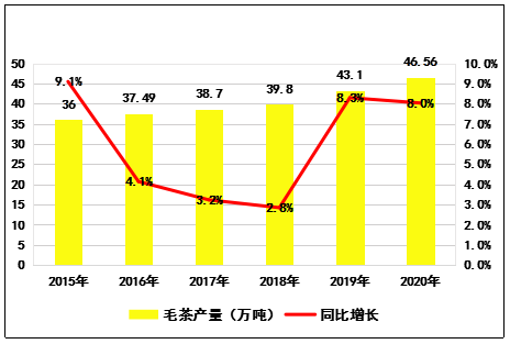 圖2 2015-2020年云南省毛茶產(chǎn)量趨勢圖