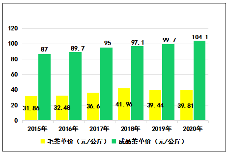 圖6 2015-2020年云南毛茶、成品茶單價(jià)對比圖