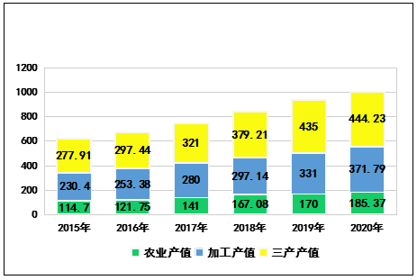 圖5 2015-2020年云南省茶產(chǎn)業(yè)結構趨勢圖(億元)