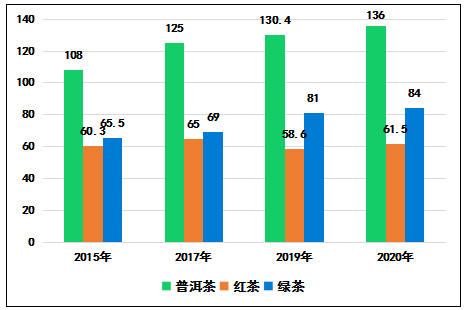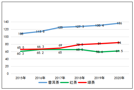 2020年,普洱茶平均單價(jià)139元/千克,比2019年增長(cháng)4.3%,紅茶平均單價(jià)61.5元/千克,比2019年增長(cháng)4.9%,綠茶平均單價(jià)84元/千克,比2019年增長(cháng)3.7%。“十三五”期間,普洱茶、綠茶價(jià)格年均增長(cháng)率分別為4.7%、5.1%,均呈穩步增長(cháng),紅茶年均增長(cháng)僅0.4%。