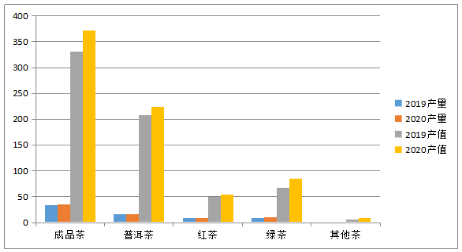 圖11 2019-2020成品茶類(lèi)產(chǎn)量產(chǎn)值比較圖