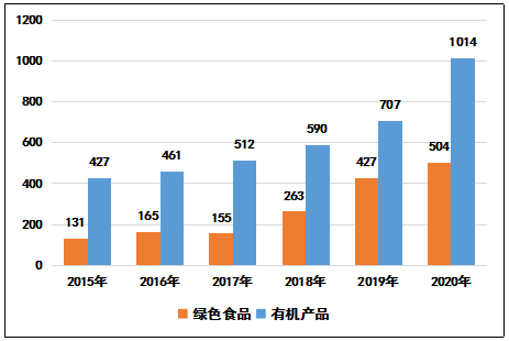 圖10 2015-2020綠色食品及有機產(chǎn)品數和組織數比較圖