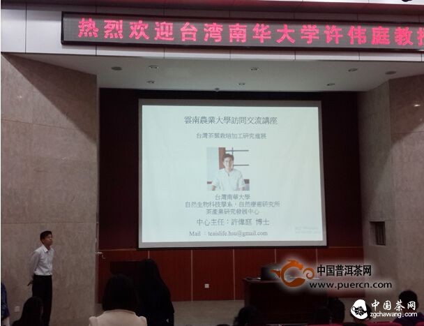 3月23日晚,臺灣南華大學(xué)許偉庭教授應邀為龍潤普洱茶學(xué)院師生作題為“臺灣茶葉栽培與加工研究進(jìn)展”的專(zhuān)題講座。