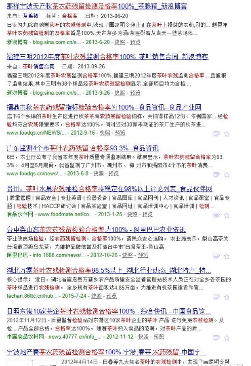 事實(shí)是,我們現在怎么檢測茶葉農殘是否超標的呢?是把茶葉研磨成粉,去檢測茶葉的固化物是否超標,在大多數情況下,這是極易檢出超標的,因為在整個(gè)茶園管理的過(guò)程中,不用藥幾乎是不可能的,只要留出足夠的時(shí)間,茶葉葉面附著(zhù)的殘留是可以減弱或是達標的,但是,你去檢測茶葉的固化物,超標的可能性就會(huì )大一些,檢測茶湯則可能完全沒(méi)問(wèn)題。而即使是按照茶葉葉子檢測,中國茶的合格率也是非常高,在搜索引擎輸入“茶葉農殘檢測合格率”搜索,茶小白得出了下列的結果: