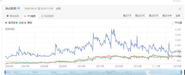 再者從相關(guān)數據我們可以明確的看出來(lái),普洱茶2006年到2015年這段期間,每2年時(shí)間普洱茶市場(chǎng)就會(huì )完成一次價(jià)格漲跌周期。下圖中,普洱茶在2011~2013年完成一次價(jià)格漲跌后,市場(chǎng)開(kāi)始平靜,醞釀,從這里就可以預見(jiàn)到了2017年,普洱茶將迎來(lái)另一個(gè)價(jià)格價(jià)格上漲周期。