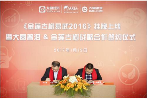 1月12日,金蓮古樹(shù)易武2016掛牌上線(xiàn)暨戰略合作簽約儀式在南京舉行,大圓普洱交易中心(簡(jiǎn)稱(chēng)“大圓普洱”)總裁葉林、勐海金蓮古樹(shù)茶業(yè)有限公司(簡(jiǎn)稱(chēng)“金蓮古樹(shù)”)總經(jīng)理林鵬鋒等參加了本次活動(dòng)。金蓮古樹(shù)也成為大圓普洱第25家茶企合作伙伴。