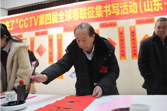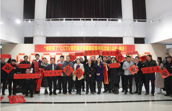 CCTV第四屆全球春聯(lián)征集活動(dòng)“春聯(lián)來(lái)了”也加入到此次展覽。在展覽現場(chǎng),作為主辦方之一的中國楹聯(lián)學(xué)會(huì )會(huì )長(cháng)蔣有泉,帶領(lǐng)山東優(yōu)秀書(shū)法家一起為臨沂市民書(shū)寫(xiě)春聯(lián),深入開(kāi)展文藝志愿者服務(wù)活動(dòng),推動(dòng)楹聯(lián)書(shū)法創(chuàng )作活動(dòng)的深入開(kāi)展。