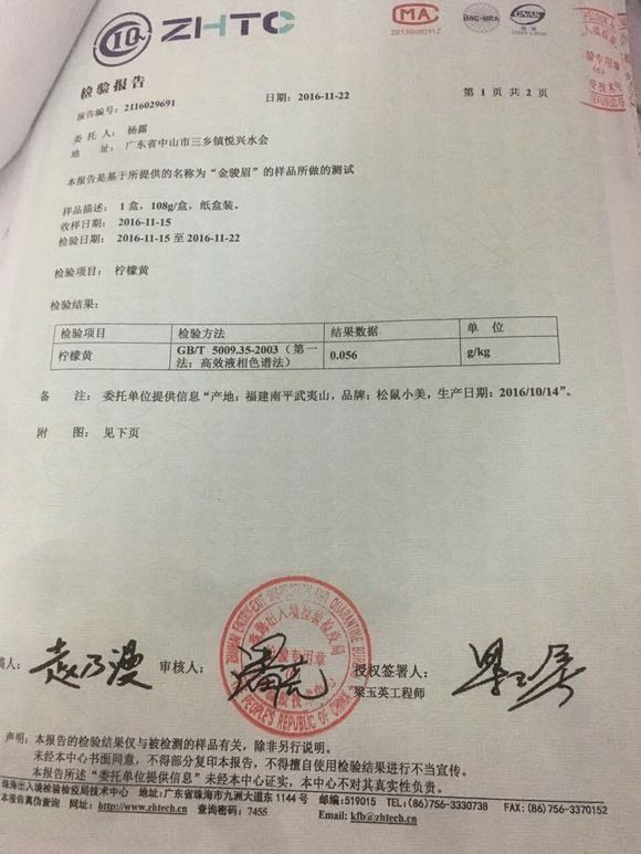 張先生原本買(mǎi)茶葉是想送朋友,但飲用茶葉時(shí),發(fā)現有大量黃色沉淀物。他將所購茶葉送至浙江省檢驗檢疫科學(xué)研究院紹興分院---紹興出入境檢驗檢疫局檢驗檢疫綜合技術(shù)中心(以下簡(jiǎn)稱(chēng)“紹興檢驗檢疫中心”)進(jìn)行檢驗。紹興檢疫檢疫中心出具的檢測報告顯示,三只松鼠公司所售茶葉中含有大量檸檬黃(一種合成色素),檢測結果為不合格。