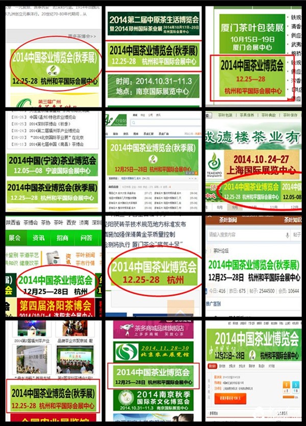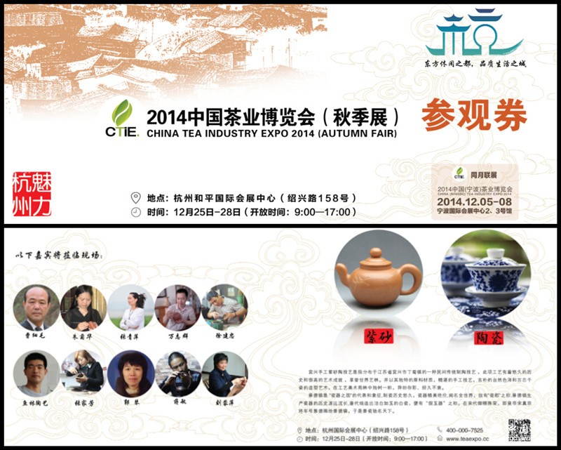 2014年12月25日-28日,2014中國茶業(yè)博覽會(huì )(秋季展),將在杭州和平會(huì )展中心盛大開(kāi)幕。作為歷史以來(lái)第一場(chǎng)冬季茶博,各項籌備工作進(jìn)展順利,成果顯著(zhù),規劃展位已訂60%,各個(gè)品牌企業(yè)火熱預定中,紫砂、工藝品區域全部售罄。上屆展會(huì )中,國內外眾多優(yōu)質(zhì)展商、品牌云集。如:大益、下關(guān)、陳升號、俊仲號、鳳寧號、臻味號、普秀、智德鴻昌、味茗堂、福今、國漢、滇紅、老順祥、利源隆、晉豐厚、茂圣、華祥源、六大茶山、正山堂、會(huì )稽紅、尤溪紅、品品香、桂人堂、武夷星、坤恒土器、津喬、中茶集團等國內知名企業(yè),利用平臺展示形象、宣傳品牌、尋找客戶(hù)、洽談合作。