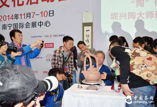 期間,國家二級教授、中國畫(huà)壇百杰、廣西省工藝美術(shù)大師——帥立功先生,中國坭興風(fēng)水陶創(chuàng )建者、坭興陶工藝美術(shù)大師——龐賦軍先生,中國坭興陶網(wǎng)總監、青年書(shū)法家——龐賦輝先生也前來(lái)助陣,帶來(lái)精彩的坭興陶陶藝表演。