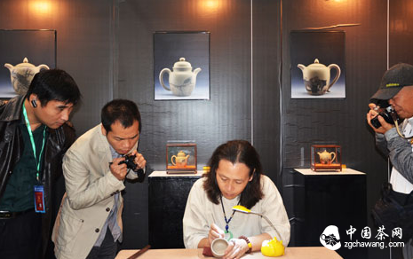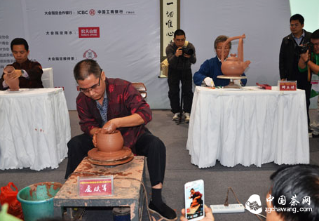 展會(huì )現場(chǎng),國家二級教授、中國畫(huà)壇百杰、廣西省工藝美術(shù)大師——帥立功先生,中國坭興風(fēng)水陶創(chuàng )建者、坭興陶工藝美術(shù)大師——龐賦軍先生,中國坭興陶網(wǎng)總監、青年書(shū)法家——龐賦輝先生為大家帶來(lái)坭興陶陶藝表演,引得大批觀(guān)眾圍觀(guān)。