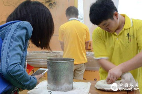 今天,斗記茶業(yè)和困鹿山茶業(yè)分別在展位上表演了現場(chǎng)制茶。斗記邀請觀(guān)眾體驗DIY茶樂(lè )趣,困鹿山更請技師李應德先生表演金瓜貢茶現場(chǎng)壓制,據介紹,金瓜貢茶始于清雍正七年即1729年,是現存陳年普洱茶中的絕品,在港臺茶界被稱(chēng)為“普洱茶太上皇”。