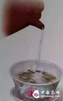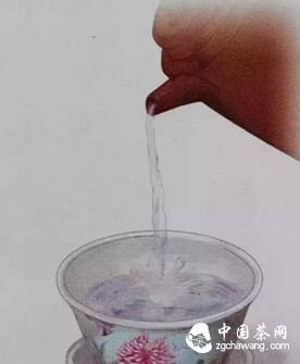 以繞圈方式將水注入蓋碗內,使每片茶葉都得到充分滋潤、受熱。