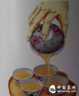 用食指、中指和大拇指拿起蓋碗,食指輕壓杯蓋中間,中指和大拇指齊齊抓住蓋杯口邊緣,將蓋杯提起,使蓋杯稍微向前傾斜,徐徐倒茶于小茶杯內。清代亦有不用小茶杯而直接使用蓋碗飲茶的方式。