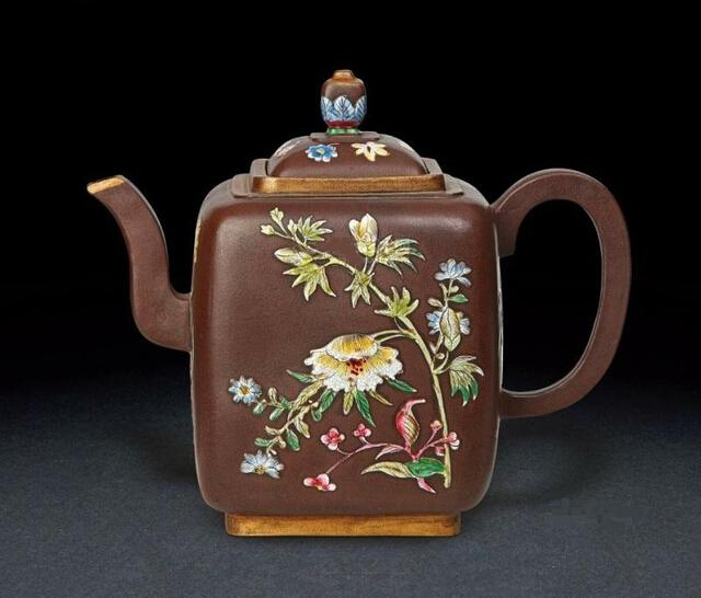 紫砂壺加彩是紫砂與釉上彩工藝的結合,始創(chuàng )于清圣祖康熙末年,流行于乾隆年間。這類(lèi)加彩紫砂壺,是精工細作而成的,為了使本色紫砂器繪上釉彩,進(jìn)行了二次燒制。從事描繪彩釉的能工巧匠們用各種色彩的釉料,描繪人物、山水、花卉以及書(shū)法等各種圖案,使壺的彩釉裝飾得雍容華貴,艷麗多彩。這時(shí)的紫砂已不是一件實(shí)用品,它已經(jīng)成為宮廷顯示國力昌盛的標志,也是貴族們展示自己身份、地位象征的器物。