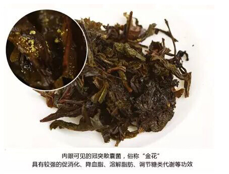 所謂“金花”,就是在原料的加工中通過(guò)發(fā)花這么一道特殊的程序,在茶中生長(cháng)出一種 叫做“冠突散囊菌”的冠突曲霉物質(zhì),茶葉中國家允許存在的二級保護菌種,早期就生長(cháng)在蟲(chóng)草,靈芝等中草藥上,俗稱(chēng)“金花”。