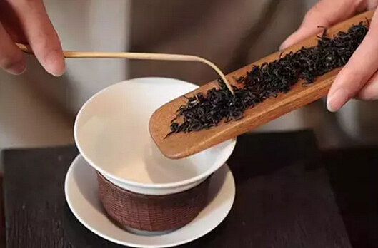需要用到茶道組中的茶匙,將茶葉分到?jīng)_泡器皿??筛鶕炔璧娜藬岛涂谖秮?lái)酌情加減投茶。