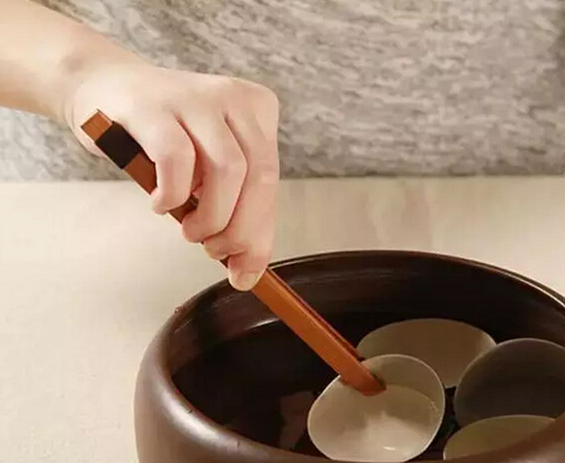 一種是直接往擺好的茶杯中沖水,另一種是用茶夾將茶杯夾到水盂上方,進(jìn)行潔具。