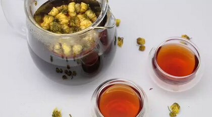 材料及制法:干菊花2.5克,普洱茶3克。將菊花與普洱置入有杯蓋瓷杯中,將滾水沖入,蓋緊杯蓋,約2分鐘即可掀蓋,菊花香味溢出,趁熱飲用。
