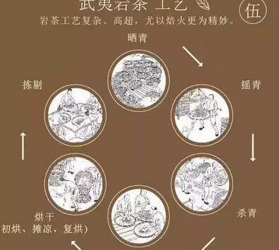 傳統武夷巖茶工藝,大致分為:曬青→(涼青、搖青)→殺青→揉捻→烘干(初烘、攤涼、復烘)→毛茶(撿剔)。