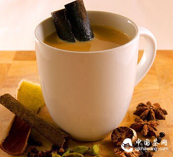 印度香料奶茶是在紅茶里加入研成粉末的呼叫、肉桂、姜、豆蔻、丁香等香料,再與牛奶和糖調和在一起沖煮而成。