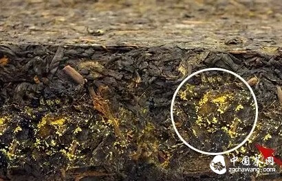 黃曲霉外觀(guān)也呈黃的片狀分布,在人為的作用下,也可以造成“金花”的樣子,常人難以分辨。最好的辦法就是從外形來(lái)看,霉菌是絲狀成片分布,呈黃色,通常分布在餅面一角,霉菌在14天至21天時(shí)面積就可達4cm至6cm,高約0.5cm~1cm,茶體本身霉變發(fā)黏,葉間界面不清楚,茶色深黑。霉變過(guò)又干燥存儲的茶,霉菌體干縮,形狀不規則,且色呈褐色。而金花通常在茶餅或磚內部,呈點(diǎn)狀顆粒,呈金黃色,茶面分布時(shí)偶有十數個(gè)金花同處分布,但花體清晰,花間界面清楚,兩種茶沖泡后區別明顯,霉變茶湯色炭黑或棕黑并渾濁,味道有極強霉變的嗆人氣味,4~5泡后湯色極淡且依舊渾濁;有金花茶的茶味更適口,并有圓順爽滑口感,有金花特有甜香,茶色紅亮,不混湯且耐數十泡味不減而色不衰。