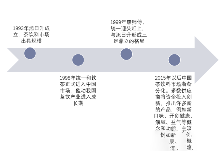 我國茶飲料行業(yè)發(fā)展時(shí)間較短,但是發(fā)展較為迅速,1993年旭日升系列茶飲橫空出世,拉開(kāi)了我國茶飲料行業(yè)的序幕,距今,茶飲料在我國已發(fā)展了二十多年。從茶飲料的發(fā)展歷程來(lái)看,我國茶飲料市場(chǎng)經(jīng)歷了幾個(gè)重要的發(fā)展節點(diǎn)。