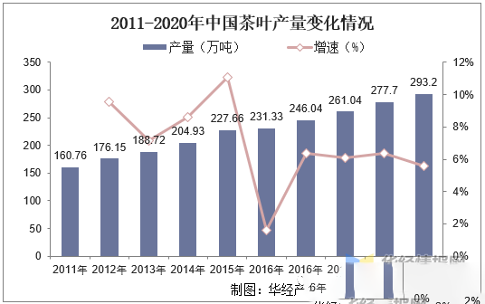 作為茶飲料的主要原料,茶葉產(chǎn)量的變化關(guān)系著(zhù)茶飲料行業(yè)發(fā)展。根據數據顯示,2011-2020年中國茶葉產(chǎn)量呈現逐年上升的趨勢,到2020年中國茶葉產(chǎn)量上升至293.2萬(wàn)噸,同比上升5.58%,茶葉產(chǎn)量的上升為我國茶飲料行業(yè)的發(fā)展提供了物質(zhì)基礎。