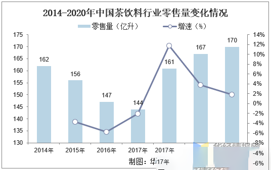 隨著(zhù)各種飲料開(kāi)始出現在我國市場(chǎng),我國茶飲料銷(xiāo)售量開(kāi)始下降,到2017年中國茶飲料銷(xiāo)售量下降至144億升。隨著(zhù)茶飲料品牌不斷推出新產(chǎn)品,再加上以茶顏悅色為首的現制茶飲的發(fā)展,以及我國茶文化的推廣,使得我國茶飲料零售量不斷上升,到2020年中國茶飲料零售量回升至170億升,同比上升1.8%。