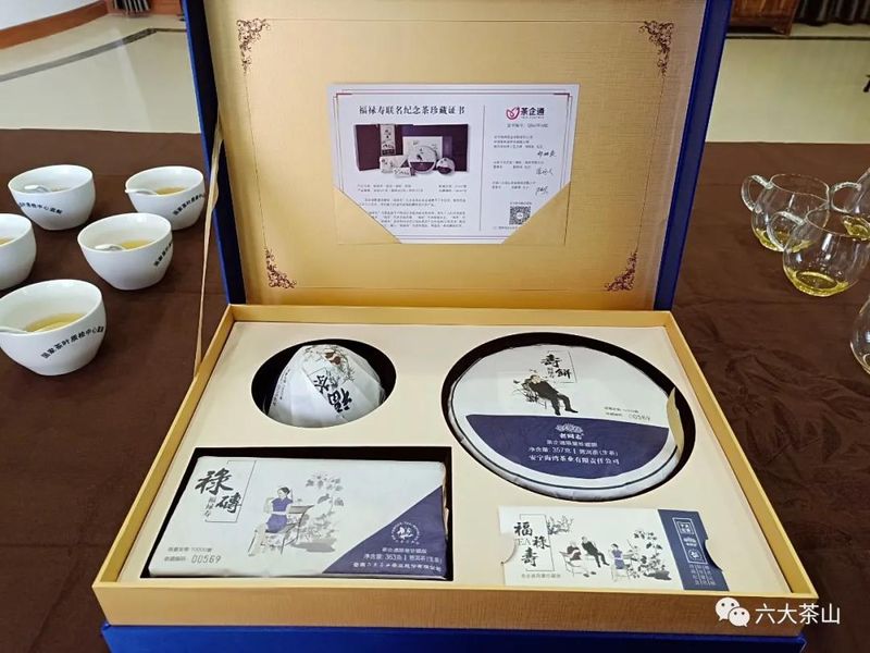 2018年,云南六大茶山茶業(yè)股份有限公司(六大茶山),云南海灣茶業(yè)有限公司(老同志)、云南下關(guān)沱茶(集團)股份有限公司(原下關(guān)茶廠(chǎng))首次聯(lián)名制作“福祿壽”?!案5搲邸贝硖烊撕弦?,代表云南茶業(yè)的福氣與長(cháng)壽,代表云南茶業(yè)能夠一直傳承下去。