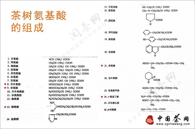 茶葉中含有約1%~4%的氨基酸(詳細組成見(jiàn)下圖),已發(fā)現的有26種,包含20種蛋白質(zhì)氨基酸和6種非蛋白質(zhì)氨基酸,其中,最主要的有茶氨酸、谷氨酸、天門(mén)冬氨酸和精氨酸。尤其是茶氨酸,幾乎為茶葉所特有,占茶葉干物質(zhì)的1%~2%,約占所有氨基酸含量的50%。于是我們討論茶葉的氨基酸,最主要研究的就是茶氨酸。