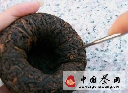 1.把茶錐沿沱茶的內渦邊沿用力插入。