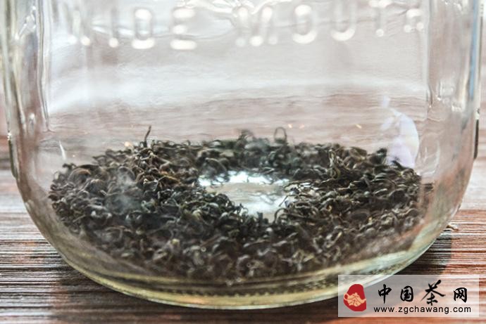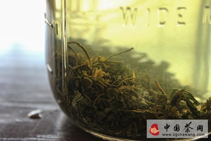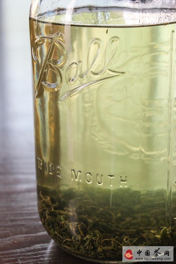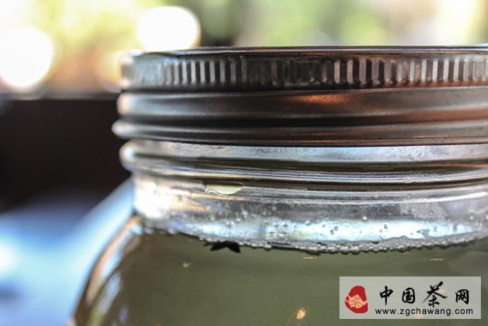 按照每12盎司水(340g)4g茶葉的比例添加茶葉和水,沒(méi)有廚房稱(chēng)的話(huà),大致估計用量也可,下圖使用的是老山春綠茶,茶葉大概覆蓋75%罐底。如果換做大瓶、或者茶葉較為蓬松,可以完全鋪滿(mǎn)罐底。
