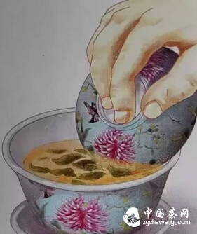 用食指、中指和大拇指拿起蓋碗,食指輕壓杯蓋中間,中指和大拇指齊齊抓住蓋杯口邊緣,將蓋杯提起,使蓋杯稍微向前傾斜,徐徐倒茶于小茶杯內。清代亦有不用小茶杯而直接使用蓋碗飲茶的方式。