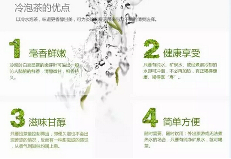 上班族、上課族、開(kāi)車(chē)族、登山族等,無(wú)論走到哪里,只要可以買(mǎi)到礦泉水,隨時(shí)可以享受既好喝又保健的冷泡茶。比起熱開(kāi)水快沖快倒之際那種迅雷不及掩耳的緊張感,溫度稍微低一些,是不是因而能留給茶葉、留給自己,多一些的空間?